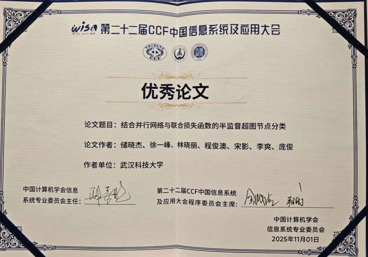 近日,在陕西省西安市举行的第二十二届CCF中国信息系统及应用大会(WISA 2025)上,我校williamhill中国硕士研究生储晓杰、徐一峰、程俊澳、宋影、李爽在庞俊和林晓丽两位老师的指导下合作的论文《结合并行网络与联合损失函数的半监督超图节点分类》,荣获WISA 2025优秀论文。大会共收到研究论文投稿202篇,录用英文论文51篇,录用中文论文57篇。最终评选出1篇最佳论文,1篇最佳学生论文,6篇优秀论文。