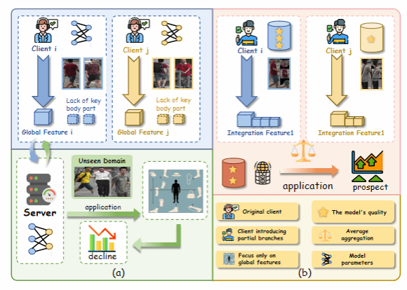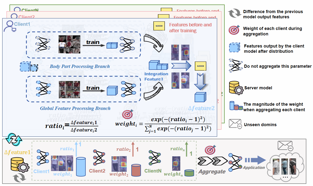 然而现有FedDG-ReID工作普遍存在两个问题:一是主流方法依赖全局特征表征,易忽略头部、躯干等关键局部细节 —— 这些细节包含更丰富且跨域不变的身份判别信息,忽视它们会使模型难以在复杂环境中区分外观相似行人,限制泛化能力;二是模型聚合时未区分不同客户端提取关键域不变特征的能力,对各客户端贡献同等对待,导致高质量客户端的判别性知识被稀释,阻碍全局模型整合利用跨域泛化所需的重要特征。