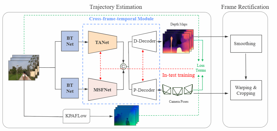 视频稳像是一项具有挑战性的任务,旨在补偿视频采集过程中的帧抖动。在视频中,运动模糊的强度会不断变化,直接结合方法无法充分利用时空信息,提供不足的跨帧补偿线索。为了解决这一难题,王薇博士团队提出了跨帧时空模块框架,采用了一种无需预训练的在测试时进行训练的策略,用于处理由各种条件引起的盲运动模糊问题,该框架利用跨帧时空特征来估计深度图和摄像机运动。大量的实验结果表明,本方法在画幅帧间连贯性方面具有更优性能。