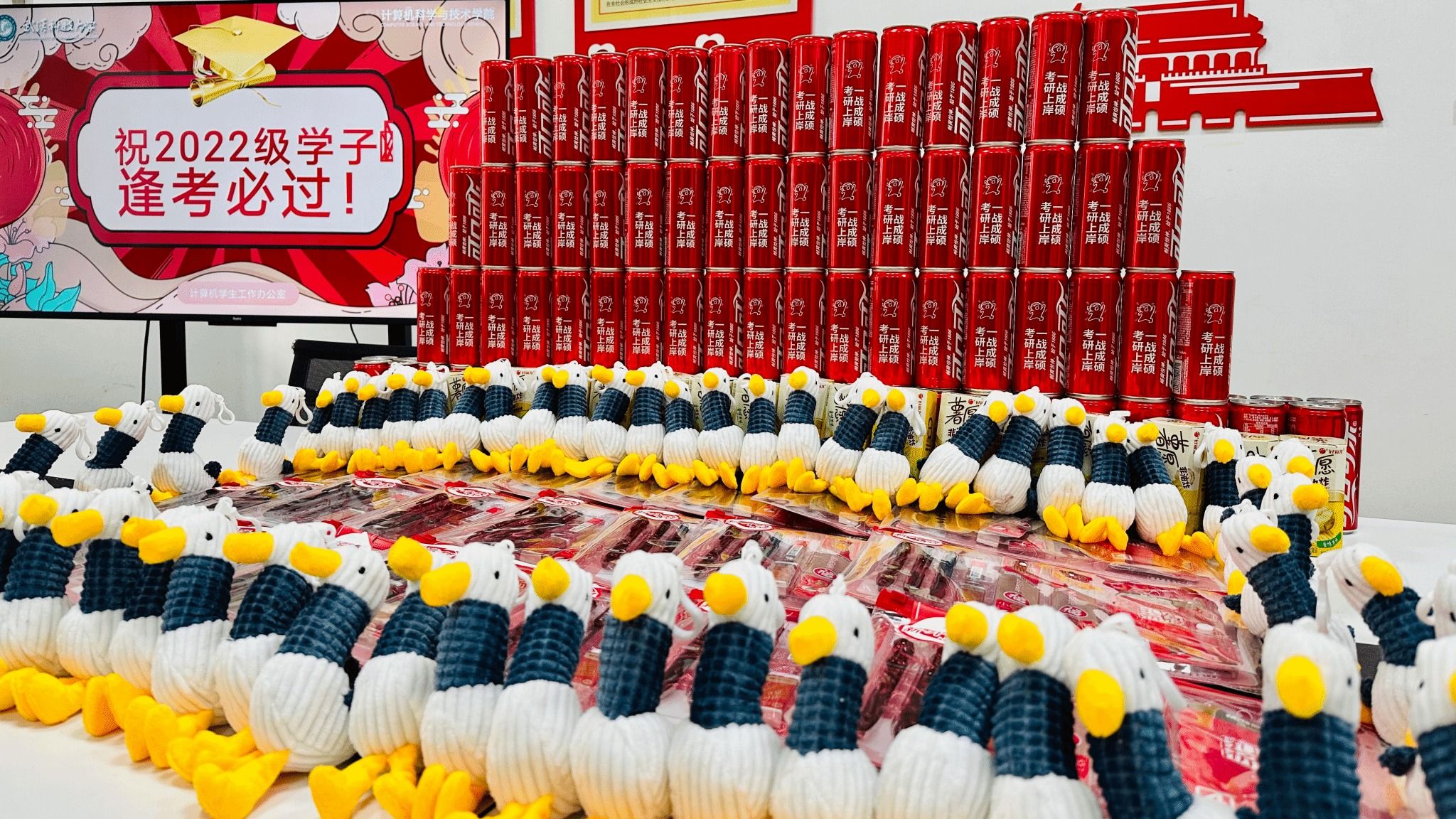活动现场,志愿者分工协作,细致完成拆封、摆放、整理、封装等环节。学院精心筹备的慰问品兼具实用性与心意:文具袋内含考试必备的中性笔、橡皮等用品;薯愿薯片寓意“薯你心愿”;有传递着乐观向上精神的“加油鸭”玩偶;印刻着“考研上岸,一战成硕”的专属定制可乐;更有学院领导、老师与低年级学子共同手写的加油贺卡,承载着师生间的牵挂与期许。与此同时,曾宪森老师与志愿者们同步前往考研自习室,悬挂“逐梦前行,全力以赴”等励志标语,精心打造“上岸墙”——39所985高校及武汉地区知名高校的校徽醒目陈列,让自习室成为充满希望与力量的备考“能量场”,助力学子们在冲刺阶段凝心聚力。
