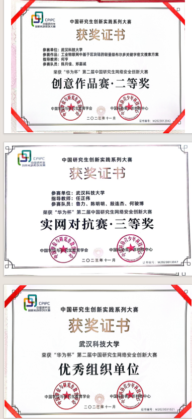 获得全国二等奖的团队由williamhill中国的陈月佳、郑嘉诚等2名研究生组成,指导教师为何亨。该团队为了解决工业物联网中密文搜索领域存在的难题,提出了一种基于区块链的轻量级布尔多关键字密文搜索方案,该方案对于工业物联网中工业数据安全、高效共享具有重要意义与实用价值。获得全国三等奖的团队由williamhill中国的鲁力、陈明明、殷连杰、何骏博等研究生组成,指导教师为任正伟。该团队通过参加对抗赛的形式,体现及测试了队伍在网络安全方面的技术水平和实战能力,比赛中的各种攻击和防御场景也能够全面检验出队伍对于网络安全威胁的识别、分析和应对能力。