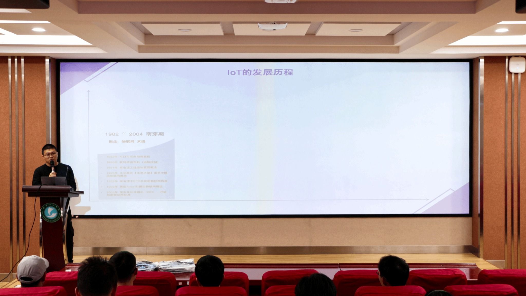 “物联网技术是信息科技产业的重要发展方向之一”,王志平向同学们介绍了物联网的基本概念与发展历程。他表示,物联网技术即物接入网络,实现人与设备、设备与设备、设备自身的管控。“物联网,由一台可以联网的设备,一套通讯协议,一个能接收数据并且可以请求设备行为的系统,以及一个应用场景组成。”王志平介绍道。