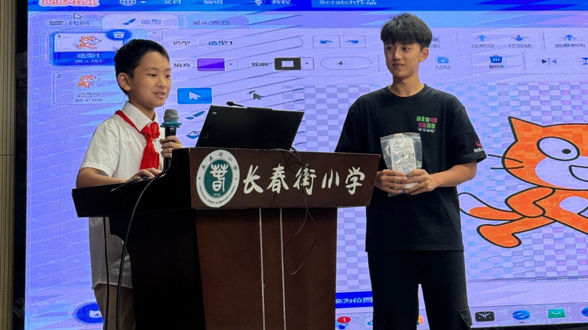 活动现场,williamhill中国大学生科普宣讲志愿者孙昊羽首先为同学们介绍了电影《流浪地球2》中的太空天梯和月面机器人“笨笨”狗,讲解了其中的物理现象和人工智能技术,然后以坐飞机、过山车和宇航员的太空生活为例,为同学们解释了超重和失重现象及其应用,以AI绘画、AI配音和老照片修复为例,为同学们介绍了人工智能在生活和电影中的应用。孙昊羽还结合自己所学的计算机专业知识,引导和鼓励同学们学习少儿编程,培养计算思维和创新能力。在编程体验环节,一位“小小程序员”上台很快就敲出了目标程序并为同学们现场讲解,展现出良好的编程逻辑思维与动手能力。