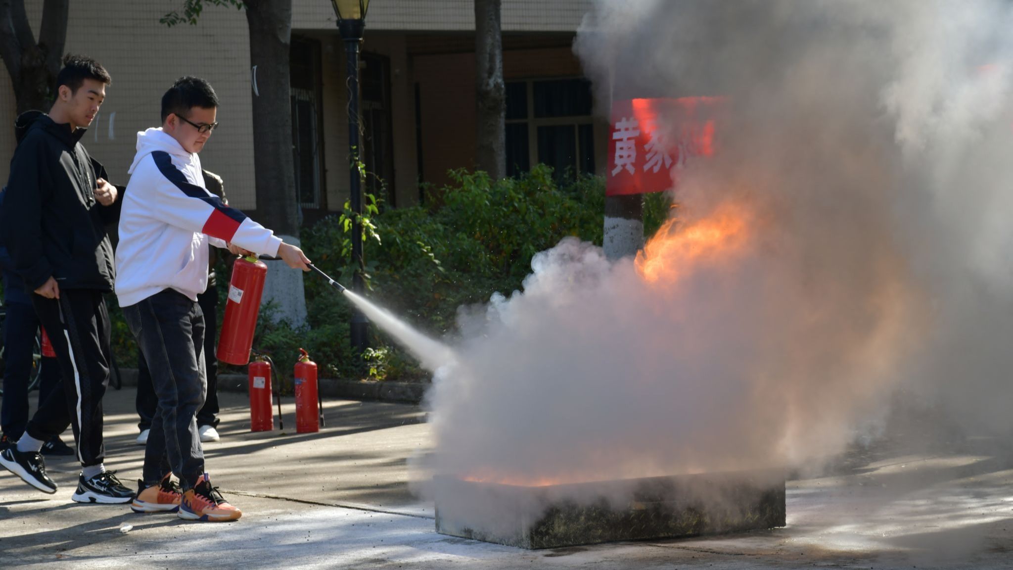 培训结束后,学院门口小广场开展了消防器材实操演练。保卫处工作人员详细讲解了灭火器的种类、使用方法和注意事项,参训师生们轮流按照提、拔、握、压等动作要领实际操作灭火器,亲身体验了灭火的过程。同时,学院还设置了节水节电宣传展板,向师生们展示节水节电的重要性和具体做法。