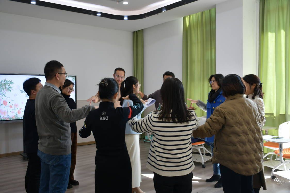 活动开始,参与人员围成“同心圆”,将手搭在前人的身体上,伴随着悠扬舒缓的音乐,并跟从胡老师的口令,开始了第一个小游戏。“摸摸你的头啊,烦恼快快走啊”“捏捏你的肩啊,轻松一整天啊”,一句句互相鼓励的话语拂去老师们工作中的疲惫。方钟明老师表感慨:“听了这些轻柔的疗愈话语,感觉自己的疲惫都被净化祛除了。”
