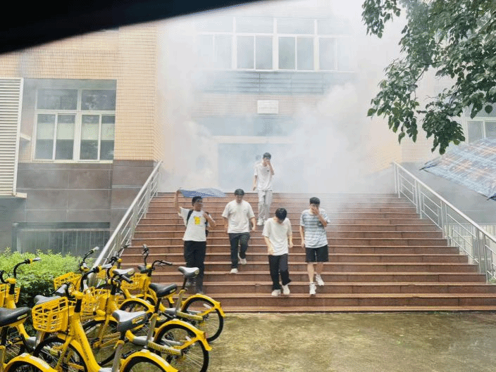 实战检验,演练锤炼应急能力:讲座余温未散,紧张逼真的疏散逃生演练随即在计算机学院楼内上演。随着模拟火警烟雾的快速升起,各楼层师生在疏散引导员的指挥下反应迅速。大家严格遵循讲座所学,用手或衣物捂住口鼻,压低身体重心,沿着预先划定的疏散路线,快速、有序地通过消防通道撤离“火场”。整个撤离过程忙而不乱,仅用时不到4分钟,所有参演师生均安全抵达楼外指定集结点。消防科段科长对疏散用时和秩序给予了肯定,并针对演练中发现的微小细节问题进行了即时点评与优化指导。