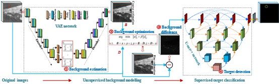 首先,使用变分自编码器无监督估计小目标红外序列图像背景;其次,采用稳定主成分追踪恢复丢失的细节,并通过交替方向乘子法将细节恢复问题转化为最优化任务;然后,采用背景差分策略凸显小目标、消除强杂波干扰;最后,采用密集跳跃连接网络检测小目标。与此同时,采用Focal loss和Dice loss作为联合损失函数,解决样本量不平衡问题。与现有SOTA方法相比,BEmST具有更好的检测性能,例如更高的检测率、更低的误检率,更大的ROC曲线面积等。