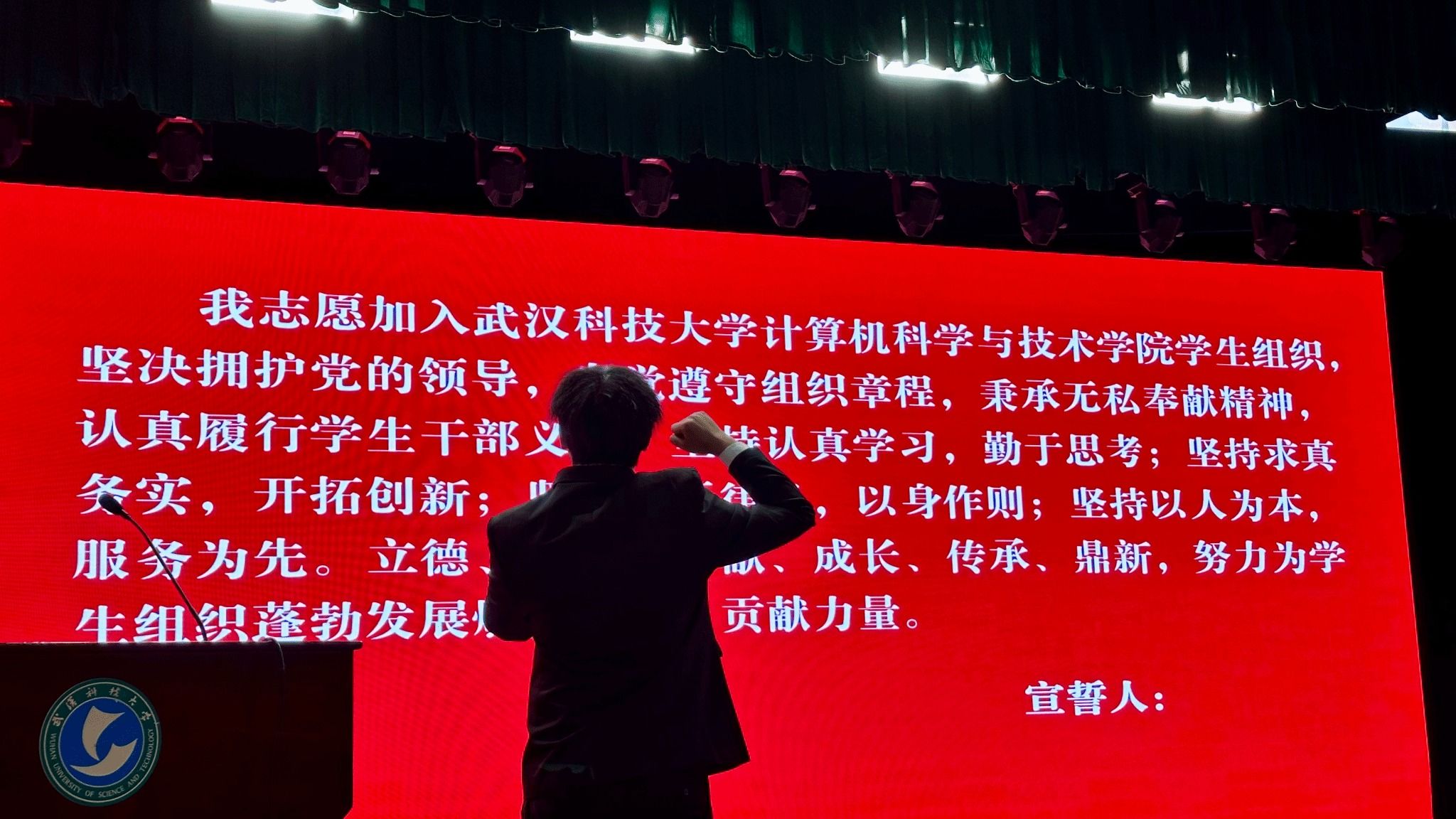 学院团委副书记齐宇凡(学生)带领学生组织全体成员进行了庄严宣誓,学院学生会执行主席蔡云政作为新一届学生组织代表进行发言。“我将履行好学生会干部的职责,和williamhill中国新一届学生组织所有负责人、委员们共同进步、共同成长,为学院的发展建设贡献自己的力量,同时也接受全院同学的监督和考验。”蔡云政在发言中说道。