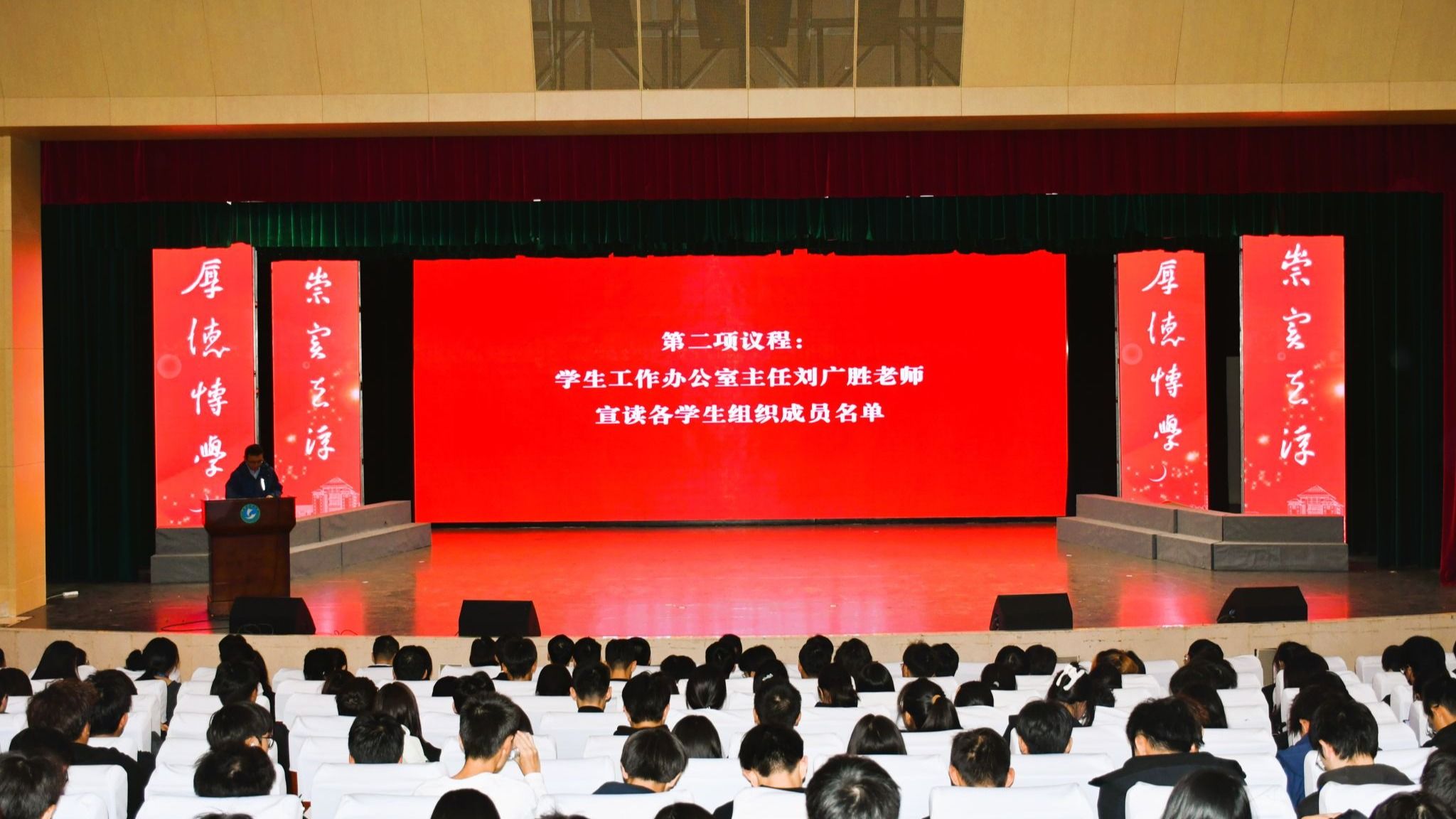 大会在庄严肃穆的国歌声中拉开序幕。随后,学院学生工作办公室主任刘广胜向参会人员宣读新一届各学生组织骨干名单。