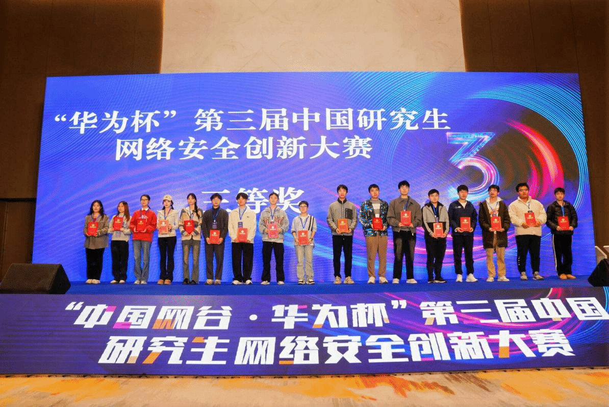 院新闻网讯(通讯员 王玉龙 曾国庆)近日,“中国网谷·华为杯”第三届中国研究生网络安全创新大赛在国家网络安全人才与创新基地圆满落幕。我院研究生李爽和郭煜德在任正伟老师的悉心指导下,荣获国家三等奖的佳绩。