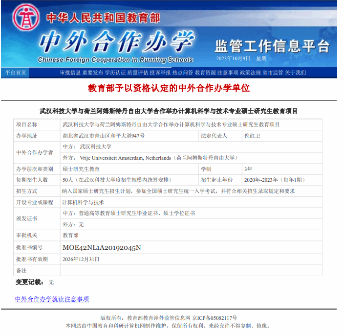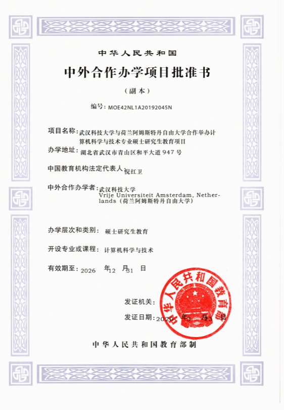 根据国家新一代人工智能发展规划和我校“双一流”建设学科的需要,我校与荷兰阿姆斯特丹自由大学合作举办计算机科学与技术专业“人工智能方向”硕士研究生教育项目(编号MOE42NL1A20192045N),引进其人工智能领域的先进课程和一流师资,培养我国急需的人工智能拔尖创新人才。项目在2020-2024年,将通过全国硕士研究生招生考试每年录取,学制为全日制3年,可全部在我校完成学习,也可赴阿姆斯特丹自由大学学习一段时间取得两校硕士学位。